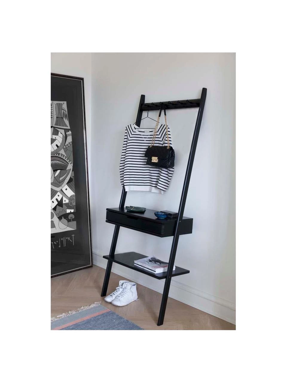 Leiter-Wandregal mit einer Schublade, einem Ablagefach und 6 Haken